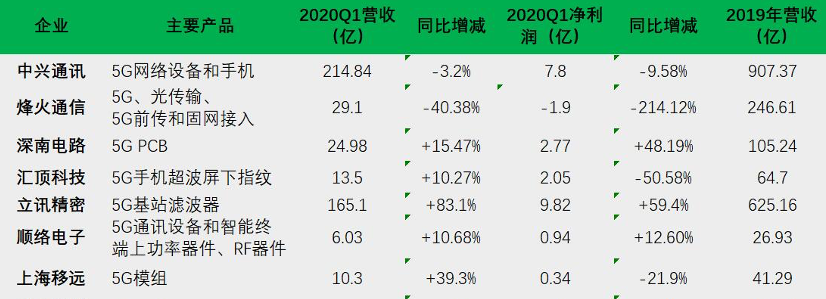 2020年Q1 5G部分上市公司業績狀況